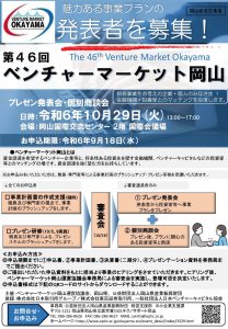 岡山県では、資金調達を希望するベンチャー企業等と、将来性がある投資先を探す金融機関やベンチャーキャピタルなどの投資家等を中心としたビジネスパートナーとのマッチングを目的として、次のとおり「第46回 ベンチャーマーケット岡山」を開催することとし、融資・投資を希望する企業を募集しますので、お知らせします。(委託先:(公財)岡山県産業振興財団) シェアする